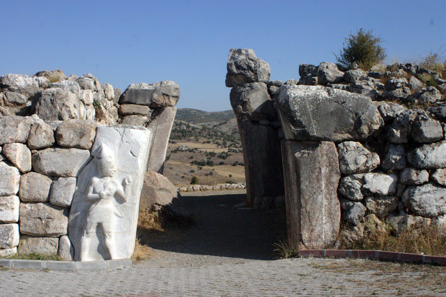 | Hattuşa'daki Kral kapısının içeriden görünüşü... Kapının solundaki tanrı kabartmasının aslı Çorum Müzesi'nde kopyası Anadolu Medeniyetleri Müzesi'nde bulunuyor. |